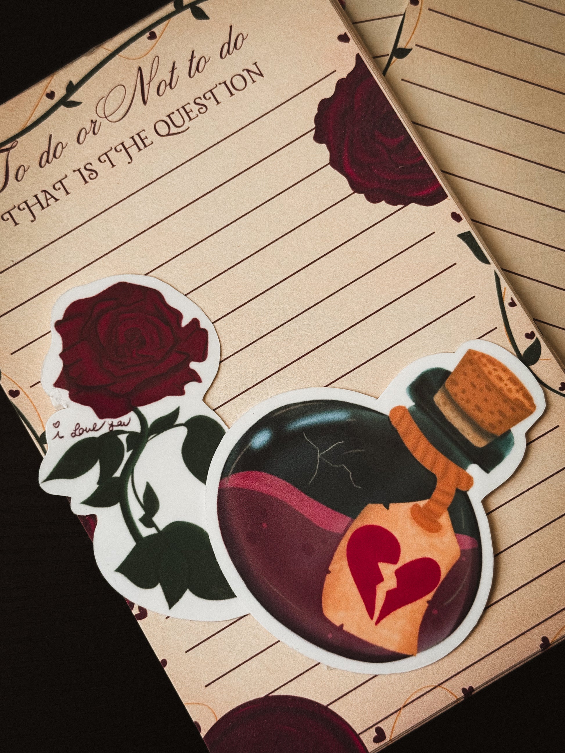 A handcrafted, literary-inspired stationery set featuring a 4×6 handmade notepad, a 2.5″ magnetic bookmark, and two 2″ stickers. Every piece is hand drawn, hand cut, and assembled by hand—perfect for book lovers, journaling, and romantic writing moments.